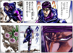 This immediately enrages Joseph, who battles Kars but is continually trapped in a dilemma where Kars pierces Lisa Lisa's feet and strings a rope through the wounds, forcing Joseph to grab the rope to stop her from falling. An overconfident Kars approaches as Joseph lights his scarf on fire and attacks, but falls from the beam clutching the rope as Kars severs it to finish off Lisa Lisa. However, this is revealed to have been Joseph's intentional setup, as he drew Kars' attention to his upper body while he arranged the loop of rope with his legs below, tricking him into stepping into the loop and forcing him to keep his opponents above the spikes below. Kars faces Joseph in a final standoff with his arm blade, but is soundly beaten as Joseph's Ripple breaks the blade and wounds his arm, knocking him off the railing and into the spikes below. Stroheim and his Nazi troops arrive along with Robert E.O. Speedwagon, Smokey Brown and the Speedwagon Foundation Special Forces. Stroheim gloats over Kars before ordering his troops to finish the Pillar Man off.
